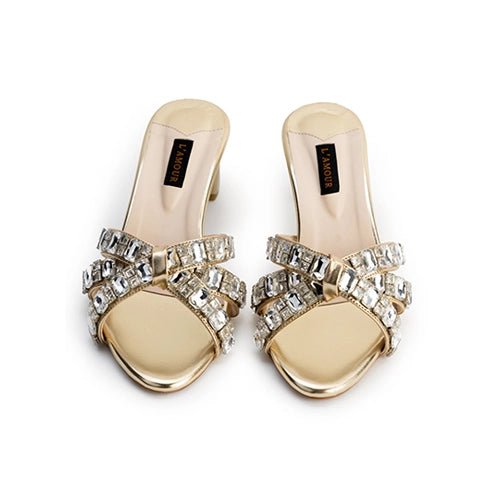 A bold sandal designed with sleek crystal straps, a supportive block heel, and striking crystal-embellished crossover bands. This pair brings a polished edge to evening wear and festive looks.