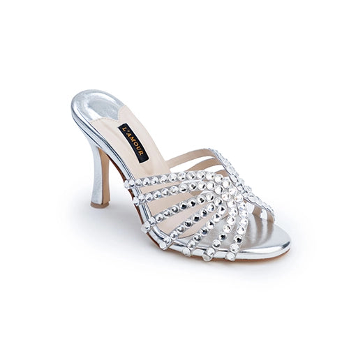 Our signature ZENIA, now in stilettos. This slide features handstitched crystals in a scalloped pattern offset against a shiny leather base. Add to your collection of staples with this versatile cult favorite.