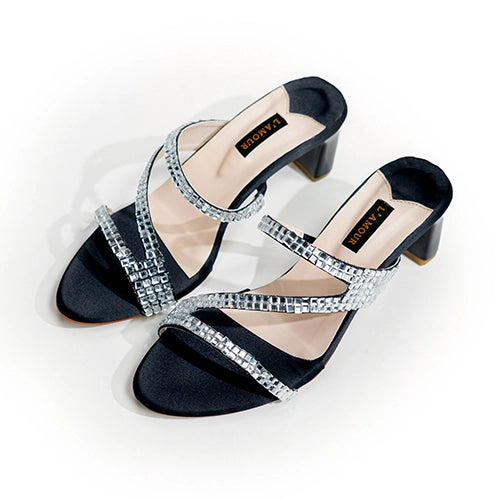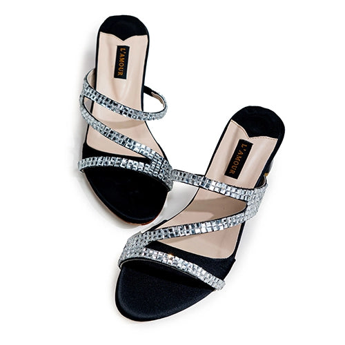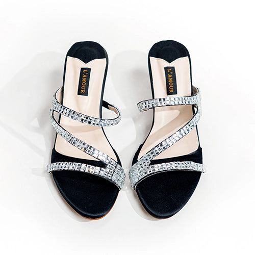 A standout piece, this pair features chunky crystal straps intertwined into a sleek silhouette. Crafted in luxurious black satin, this block heel promises to shine bright with its diamontee details.